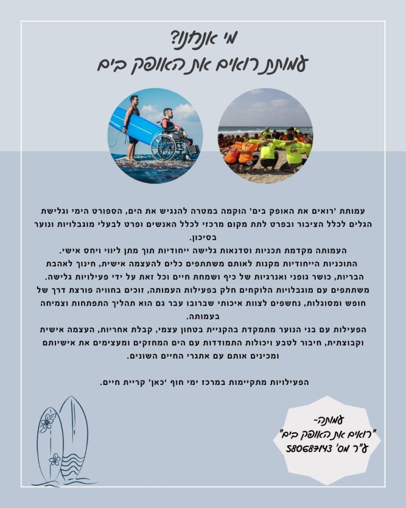 במקום שבו המילים נגמרות והיבשה הופכת צפופה מדי – הגלים מתחילים לעבוד. עמותת "רואים את האופק בים" מזמינה את הדור הצעיר למסע של שינוי מהותי, דרך אהבה לים, עוצמת הגלישה וכלים לחיים אחרים.